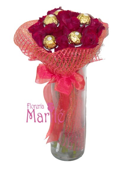 Bello florero cilíndrico elaborado con 12 rosas ecuatorianas rojas, acompañado de pequeños bombones Ferrero Rocher, decorado con una elegante malla roja y moño de organza.