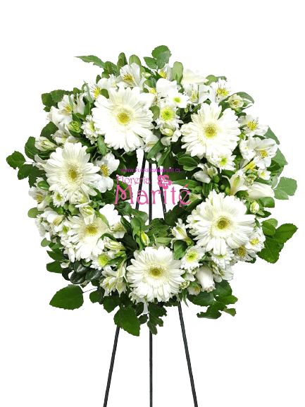 Pequeña corona floral, elaborada con gerberas blancas, rosas ecuatorianas y pequeñas flores silvestres.