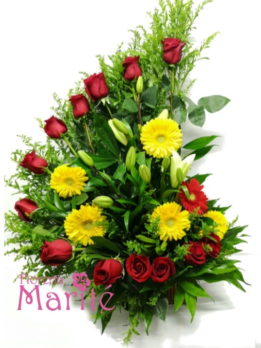 Bello arreglo floral elaborado con rosas ecuatorianas, gerberas, lilium, solidado y follaje.
