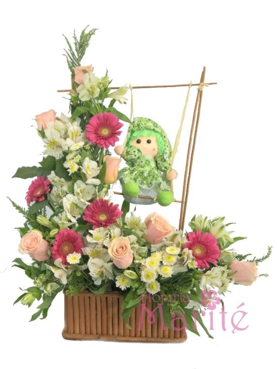 Hermoso arreglo floral con forma de juego infantil elaborado con finas flores seleccionadas ; gerberas , maúles , rosas y el más fino follaje.