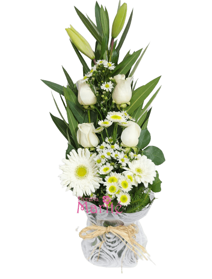 Bella malla floral elaborada con rosas ecuatorianas, gerberas, y lilium.