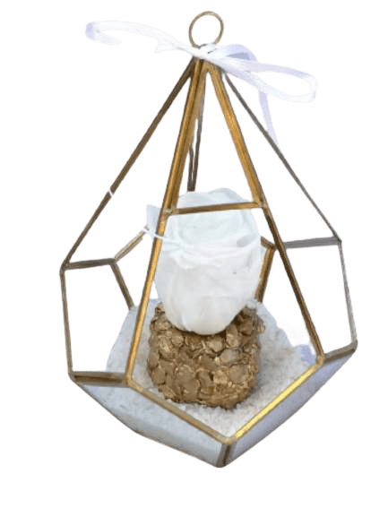 Decoración especial moderna de diseño de interiores – Tamaño 16 cm x 16 cm bordes con acabado metálico para colgante triangular – Forma de octágono. En su interior contiene una rosa eterna. duración de 1 a 3 años.
