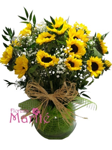 Bella Pecera de 30 girasoles, decorada con malla floral e ilusiones.