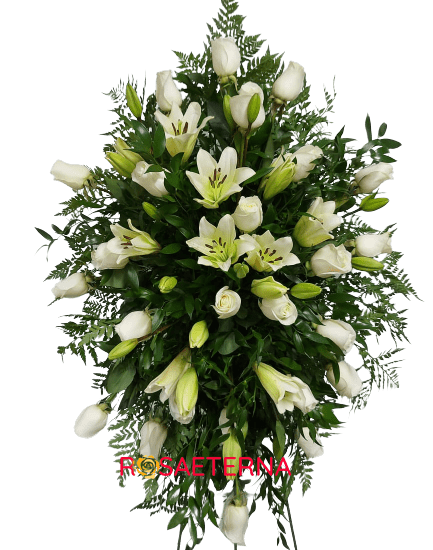 Pedestal pequeño elaborado con 15 rosas ecuatorianas, 15 lillium, 10 gerberas blancas y astromelias, decorado con ilusiones.