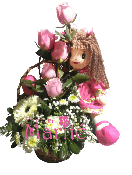 Bello arreglo floral elaborado con rosas ecuatorianas rosadas, acompañado de una muñeca.