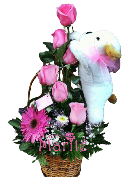 Bello arreglo floral elaborado con rosas ecuatorianas rosadas,