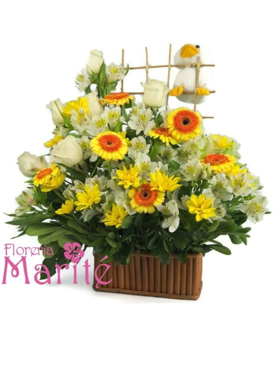Composición floral que representa a un tierno pollito jugando. Está elaborado con gerberas, astromelias,maules en tonos amarillos, acompañados de rosas blancas y un pequeño peluche. Todo dispuesto sobre una base de madera de finas terminaciones.