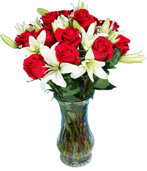 Hermoso florero confeccionado con 15 rosas ecuatorianas de color rojo, acompañadas de 10 liliums blancos.