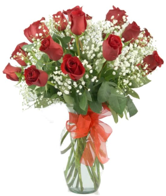 Florero samaritano con 24 rosas rojas ecuatorianas acompañadas de gypsophila o ilusion de la novia con un moño de cinta roja decorativa