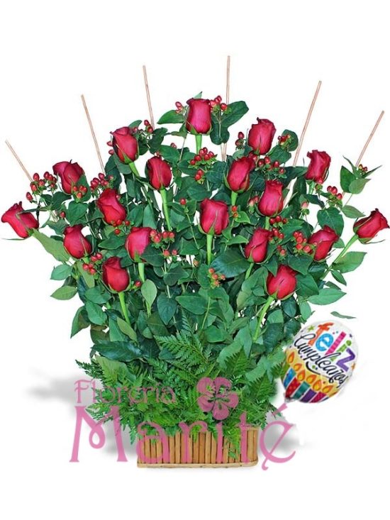 Arreglo floral confeccionado con 18 rosas ecuatoriana e hypericum.