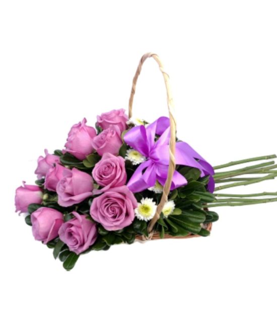Hermoso arreglo floral elaborado en un elegante violetero de mimbre, cada rosa va insertada en espuma floral, la que da un mayor durabilidad a las bellas rosas lilas.